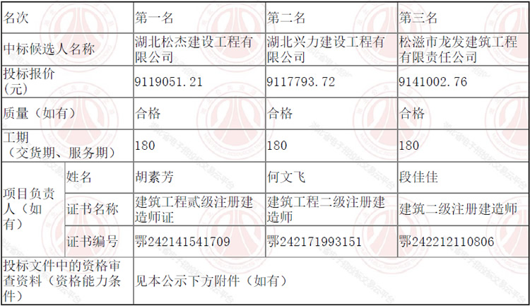 松滋市鄉(xiāng)鎮(zhèn)人才公寓建設(shè)項目松滋市鄉(xiāng)鎮(zhèn)人才公寓建設(shè)項目第二標(biāo)段(八寶鎮(zhèn))于2022年07月15日在湖北省電子招投標(biāo)交易平臺發(fā)布招標(biāo)公告,2022年08月09日在松滋市開標(biāo)室(1)開標(biāo),并于2022年08月09日完成評標(biāo)工作。根據(jù)評標(biāo)委員會提交的評標(biāo)報告,松滋金投商業(yè)開發(fā)有限公司已經(jīng)確認(rèn)評標(biāo)結(jié)果,現(xiàn)進(jìn)行評標(biāo)結(jié)果公示。