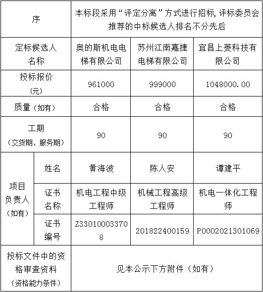 金投?彩虹灣一期(S1號樓綜合商業(yè))及配套工程金投?彩虹灣(一期S1#樓綜合商業(yè))電梯采購及安裝項目于2023年11月14日在湖北省電子招投標(biāo)交易平臺發(fā)布招標(biāo)公告,2023年12月11日在松滋市開標(biāo)室(2)開標(biāo),并于2023年12月11日完成評標(biāo)工作。根據(jù)評標(biāo)委員會提交的評標(biāo)報告,湖北松滋金投置業(yè)有限公司已經(jīng)確認(rèn)評標(biāo)結(jié)果,現(xiàn)進行評標(biāo)結(jié)果公示。